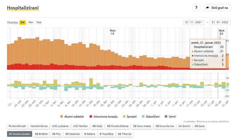 Po zadnjih podatkih vlade v bolnišnicah zdravijo 599 covidnih bolnikov, dan prej 580, od tega 144 na intenzivni negi, dan prej 150. V četrtek je umrlo 12 covidnih bolnikov. Po podatkih sledilnika v SB Slovenj Gradec zdravijo 23 covidnih bolnikov. Od teh 2 potrebujeta intenzivno zdravljenje. Na novo so v bolnišnico sprejeli 5 oseb, 3 so odpustili v domačo oskrbo.