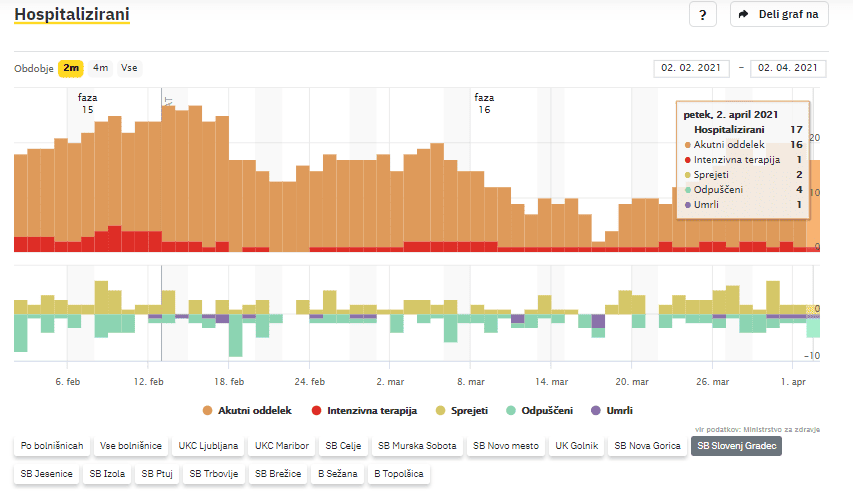 V Splošni bolnišnici Slovenj Gradec se po zadnjih podatkih Covid-19 sledilnika zdravi 17 oseb s potrjeno okužbo, ena oseba na oddelku intenzivne terapije. Na novo so sprejeli 2 covidna bolnika, v domačo oskrbo pa odpustili 4. Umrla je ena oseba s potrjeno okužbo.