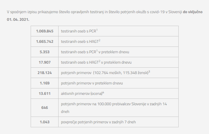 Število opravljenih testiranj in število potrjenih okužb do vključno 1. 4. 2021: