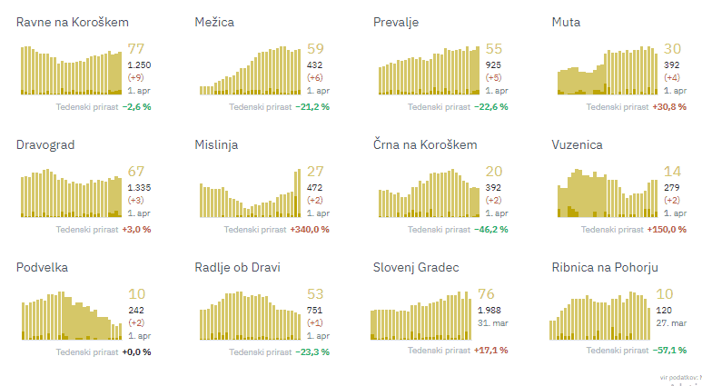 Ravne na Koroškem 9, Mežica 6, Prevalje 5, Muta 4, Dravograd 3, Mislinja 2, Črna na Koroškem 2, Vuzenica 2, Podvelka 2, Radlje ob Dravi 1.
