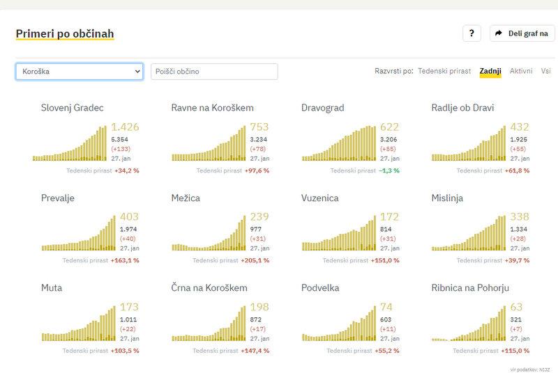 Na Koroškem so včeraj potrdili 508 novih okužb, dan prej 275, pred tednom dni 250. V Slovenj Gradcu so jih zabeležili 133, na Ravnah na Koroškem 78, v Dravogradu in Radljah ob Dravi po 55, na Prevaljah 40, v Mežici in Vuzenici po 31, v Mislinji 28, na Muti 22, v Črni na Koroškem 17, v Podvelki 11, v Ribnici na Pohorju 7.