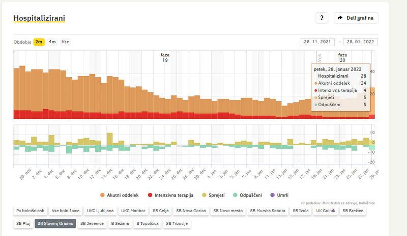 Po zadnjih podatkih vlade v bolnišnicah zdravijo 719 covidnih bolnikov, dan prej 708, od tega 134 na intenzivni negi, dan prej 125. Umrlo je 7 covidnih bolnikov. Po podatkih sledilnika v SB Slovenj Gradec zdravijo 28 covidnih bolnikov. Od teh 4 potrebujejo intenzivno zdravljenje. Na novo so v bolnišnico sprejeli 5 oseb, v domačo oskrbo so odpustili 5 oseb.