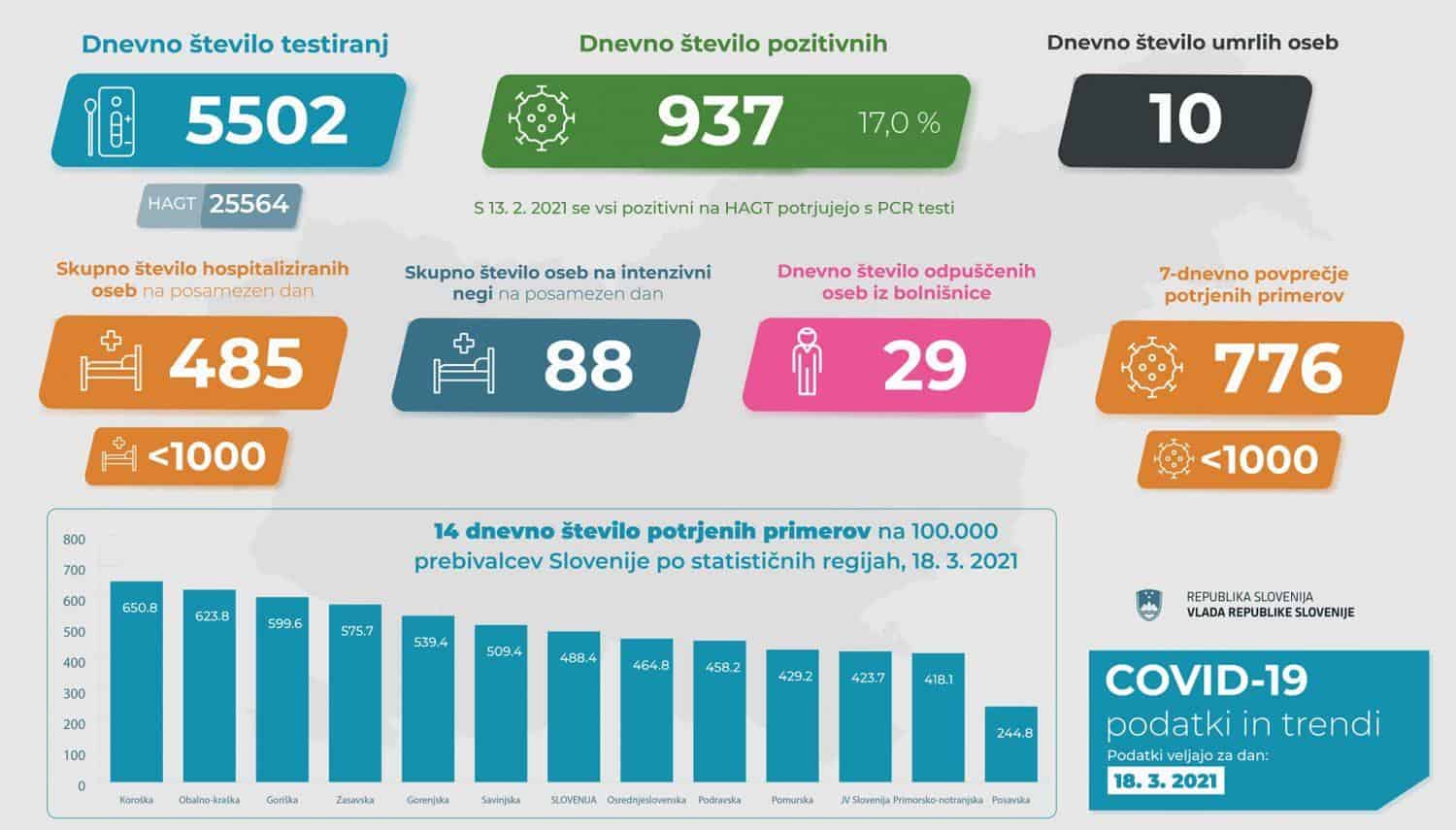 14-dnevna incidenca na ravni države znaša 488,4, incidenca pa se je najbolj povečala v koroški regiji, kjer znaša 681 in obalno-kraški regiji, kjer znaša 624. Na ravni države 7-dnevno število potrjenih primerov na 100 tisoč prebivalcev znaša skoraj 259, kar je slabše kot včeraj, ko je znašalo 251. Obalna-kraška regija ima najvišjo incidenco, sledi ji Koroška.