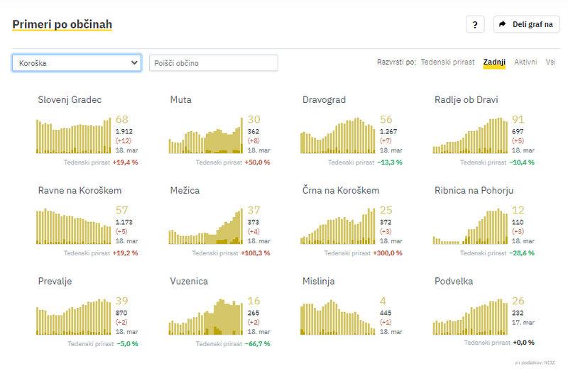 Na Koroškem so nove okužbe potrdili v enajstih občinah, največ v Slovenj Gradcu, kjer so jih zabeležili 12. Na Muti so jih potrdili 8, v Dravogradu 7, v Radljah ob Dravi in na Ravnah na Koroškem po 5, v Mežici 4, v Črni na Koroškem in Ribnici na Pohorju po 3, na Prevaljah in v Vuzenici po 2, v Mislinji 1.