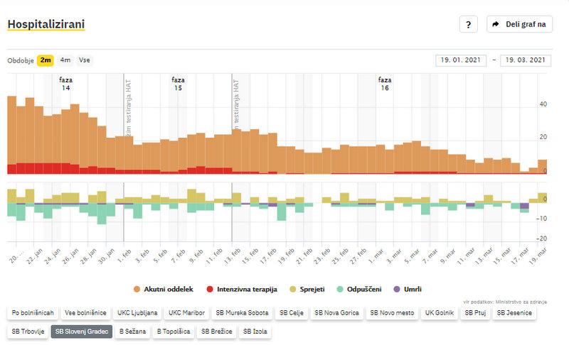 V SB Slovenj Gradec zdravijo 9 covidnih bolnikov, 1 potrebuje intenzivno terapijo. Na novo so na zdravljenje sprejeli 5 bolnikov, v domačo oskrbo pa niso odpustili nikogar, kažejo podatki Sledilnika za covid-19.