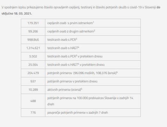 Število opravljenih cepljenj, testiranj in število potrjenih okužb s covid-19 v Sloveniji do vključno 18. 03. 2021.