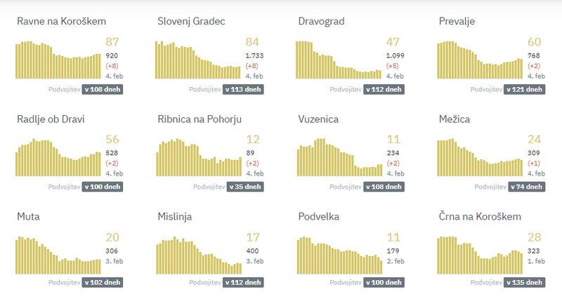 Na Koroškem so v četrtek nove okužbe potrdili v osmih občinah. V Slovenj Gradcu in na Ravnah so jih zabeležili po 8, v Dravogradu 5, na Prevaljah, v Radljah ob Dravi, Vuzenici in Ribnici na Pohorju po 2, v Mežici pa so potrdili 1 novo okužbo.