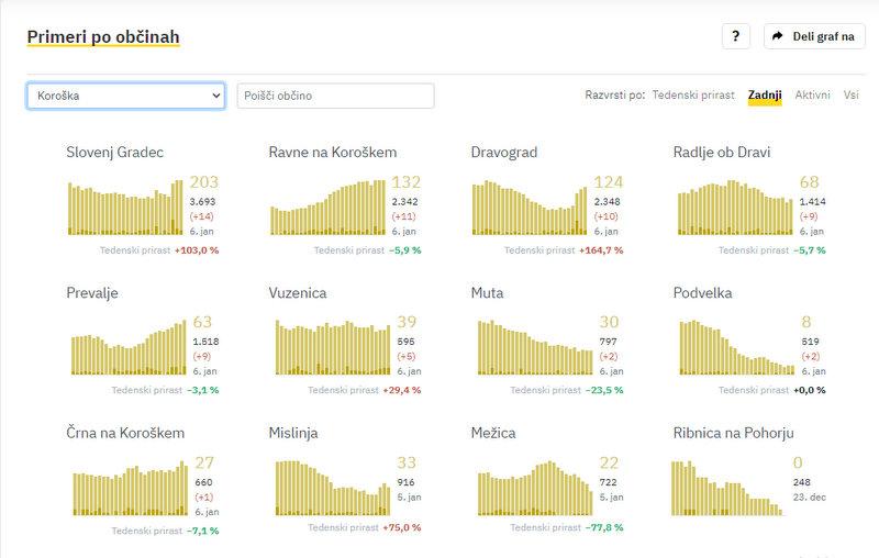 Na Koroškem so včeraj potrdili 63 novih okužb, dan prej 68, pred tednom dni pa 28. V Slovenj Gradcu so jih včeraj zabeležili 14, na Ravnah na Koroškem 11, v Dravogradu 10, v Radljah ob Dravi in na Prevaljah po 9, v Vuzenici 5, na Muti in v Podvelki po 2, v Črni na Koroškem pa 1.