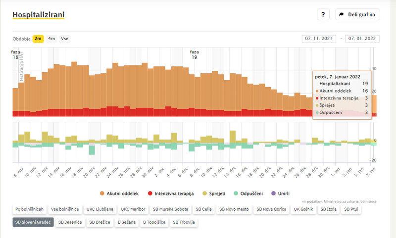 Po zadnjih podatkih vlade v bolnišnicah zdravijo 547 covidnih bolnikov, dan prej 550. od tega 155 na intenzivni negi, dan prej 161. V četrtek je umrlo devet covidnih bolnikov. Po podatkih sledilnika v SB Slovenj Gradec zdravijo 19 covidnih bolnikov. Od teh 3 potrebujejo intenzivno zdravljenje. V domačo oskrbo so odpustili 3 osebe, 3 pa so na novo sprejeli v bolnišnico.