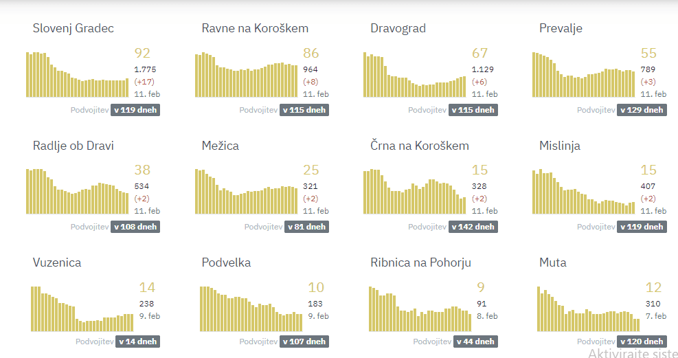 Slovenj Gradec 17, Ravne na Koroškem 8, Dravograd 6, Prevalje 3, Radlje ob Dravi 2, Mežica 2, Črna na Koroškem 2, Mislinja 2.
