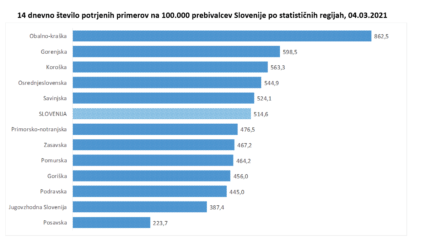 14-dnevno število potrjenih primerov na 100.000 prebivalcev Slovenije po statističnih regijah, 04. 03. 2021.