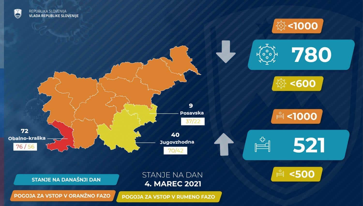 Tako v rdeči fazi sproščanja ukrepov ostaja obalno-kraška regija. V rumeno fazo pa sta vstopili posavska in jugovzhodna regija. Ostala država je po besedah Bratuše v oranžni fazi.