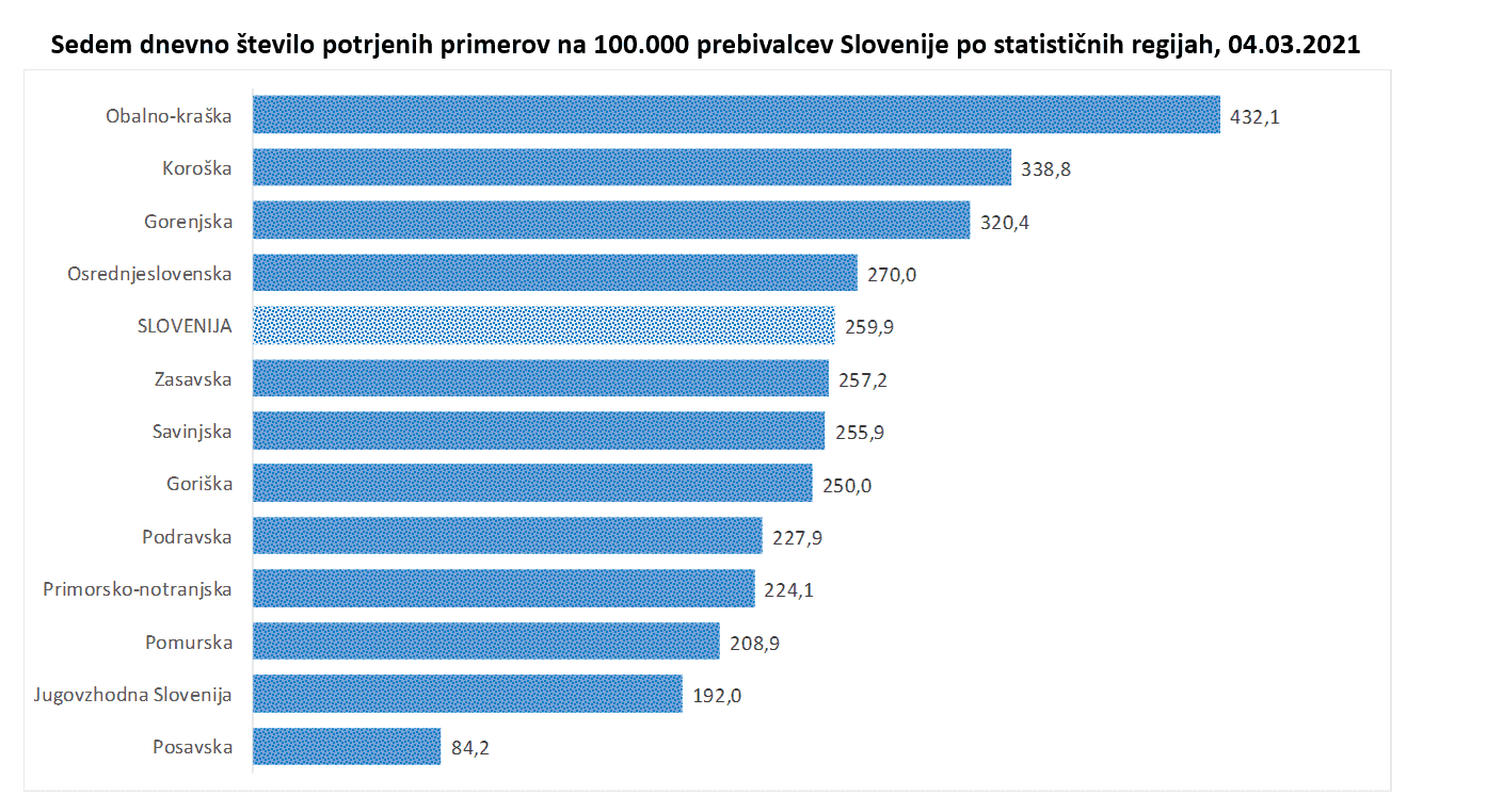 Sedemdnevno število potrjenih primerov na 100.000 prebivalcev Slovenije po statističnih regijah, 04. 03. 2021.