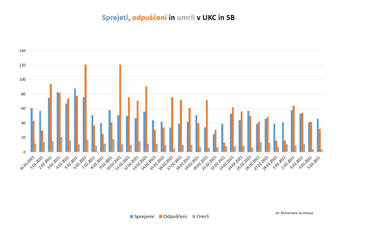 "Žal moramo danes poročati o povečanju števila Covid-19 pacientov v naših bolnišnicah in sicer se danes tam zdravi 10 pacientov več kot včeraj in sicer 521," je navedla Bratuša. Na intenzivni terapiji se zdravi 85 pacientov (1 manj kot včeraj). V UKC Ljubljana se danes zdravi 181 oseb, od tega 26 na intenzivni terapiji.