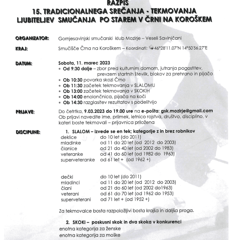 Ob 11.30 uri se bo na smučišču Črna na Koroškem pričela tekma smučarjev, ki jo bodo začeli najmlajši ljubitelji smučanja po starem in nadaljevali po starostnih kategorijah do najstarejših, ki štejejo tudi čez 80 let. Posebna atrakcija bodo skoki na skakalnici, ki jo bodo pripravili na smučišču.