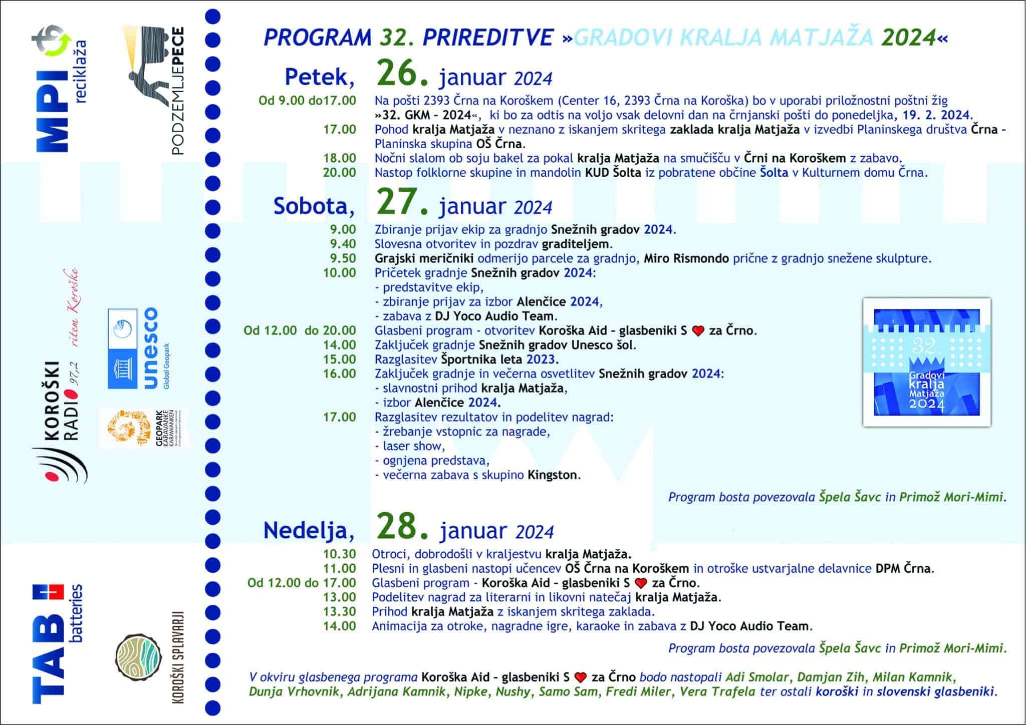 Prireditev se uradno pričenja danes, v petek, 26. januarja do nedelje, 28. januarja 2024 in to na Matevžavih travnikih pod stadionom v centru Črne na Koroškem. Glavno dogajanje bo potekalo jutri, 27. januarja, ko bodo številni graditelji snežnih skulptur skozi dan ustvarjali iz snega in ledenih ploskev, zvečer pa vas čaka zabava z zasedbo Kingston.