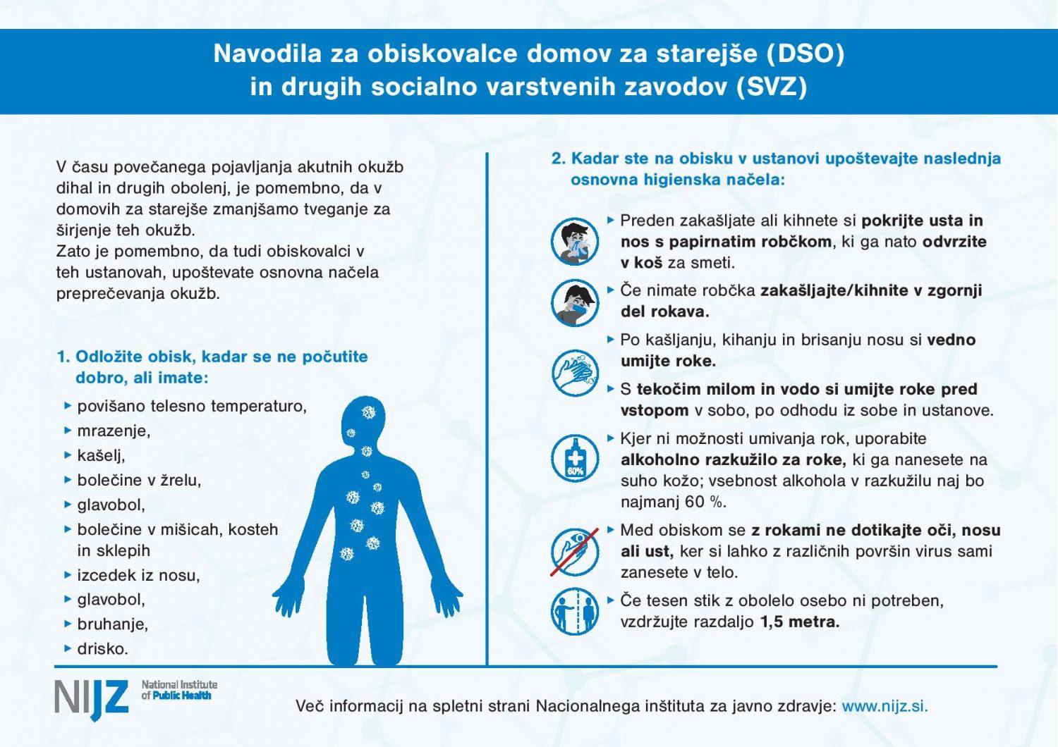 Na podlagi usmeritev Nacionalnega inštituta za javno zdravje (NIJZ) je Komisija za zdravstveno dejavnost Skupnosti socialnih zavodov Slovenije pozvala izvajalce institucionalnega varstva k uvedbi aktivnosti programa preprečevanja in obvladovanja širjenja okužb z novim koronavirusom, informiranju in izobraževanju, predvsem zaposlenih, glede potrebnih ukrepov preprečevanja in obvladovanja okužb, so sporočili iz Ministrstva za delo, družino, socialne zadeve in enake možnosti.