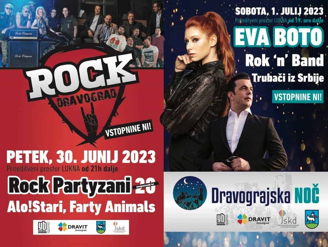 Zvečer v soboto, 1. julija, nas od 19. ure naprej čaka nepozabna Dravograjska noč. Za glasbo in zabavo bodo najprej poskrbeli trobilni sestavi iz Slovenije in trubači iz Srbije, kasneje pa Eva Boto in Rok’n’Band.