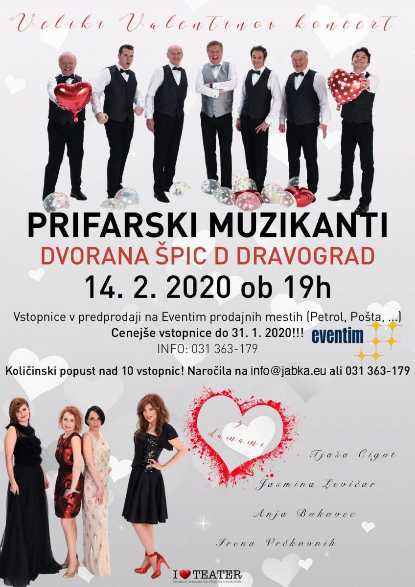 V petek, 14. februarja 2020 bo v Športni dvorani Špic D v Dravogradu veliki Valentinov koncert Prifarski muzikanti z damami. Na prekrasnem glasbenem večeru boste lahko prisluhnili najlepšim ljubezenskim pesmim po izboru Prifarcev. Na koncertu bo tako slišati slovenske ljudske pesmi, popevke, ljudske pesmi drugih narodov in zimzelene svetovne uspešnice.