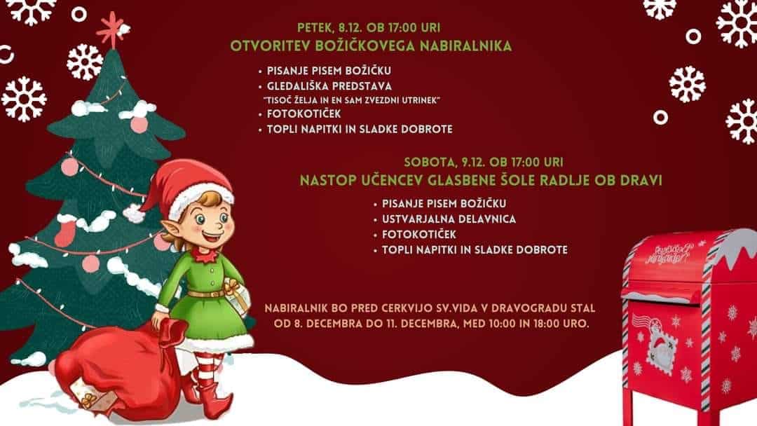 Jutri, v petek, 8. decembra 2023, ob 17. uri, bodo v Dravogradu otvorili Božičkov nabiralnik s pestrim spremljevalnim programom. Najmlajše čaka gledališka predstava "Tisoč želja in en sam zvezdni utrinek", pisanje pisem Božičku, fotokotiček, topli napitki in sladke dobrote.
