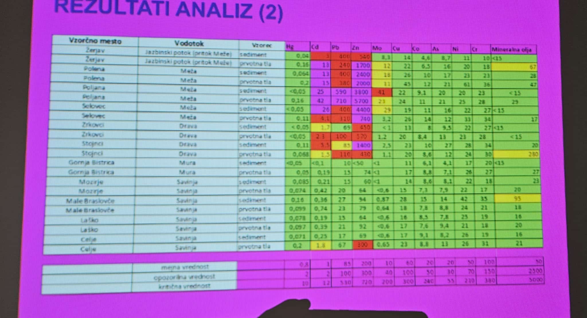 Na današnji predstavitvi rezultatov vzorcev mulja in prvotnih tal ob reki Meži so v Dravogradu žal izvedeli, da so vsebnosti težkih kovin ( cink, kadmij, svinc ) presežene, izmerjene vrednosti so nad mejno vrednostjo. Glede mulja je to bilo že znano, sedaj so dodana tudi prvotna tla.