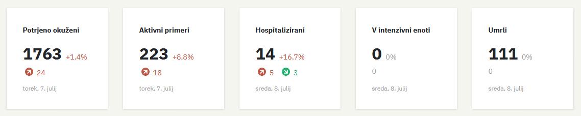 Včeraj je bilo hospitaliziranih 14 bolnikov, kar je dva več kot dan prej. Nihče od njih ni potreboval intenzivne nege, tri osebe pa so odpustili v domačo oskrbo, je sporočila vlada. Doslej so v Sloveniji skupno potrdili 1763 okužb, umrlo pa je 111 bolnikov s covidom-19.