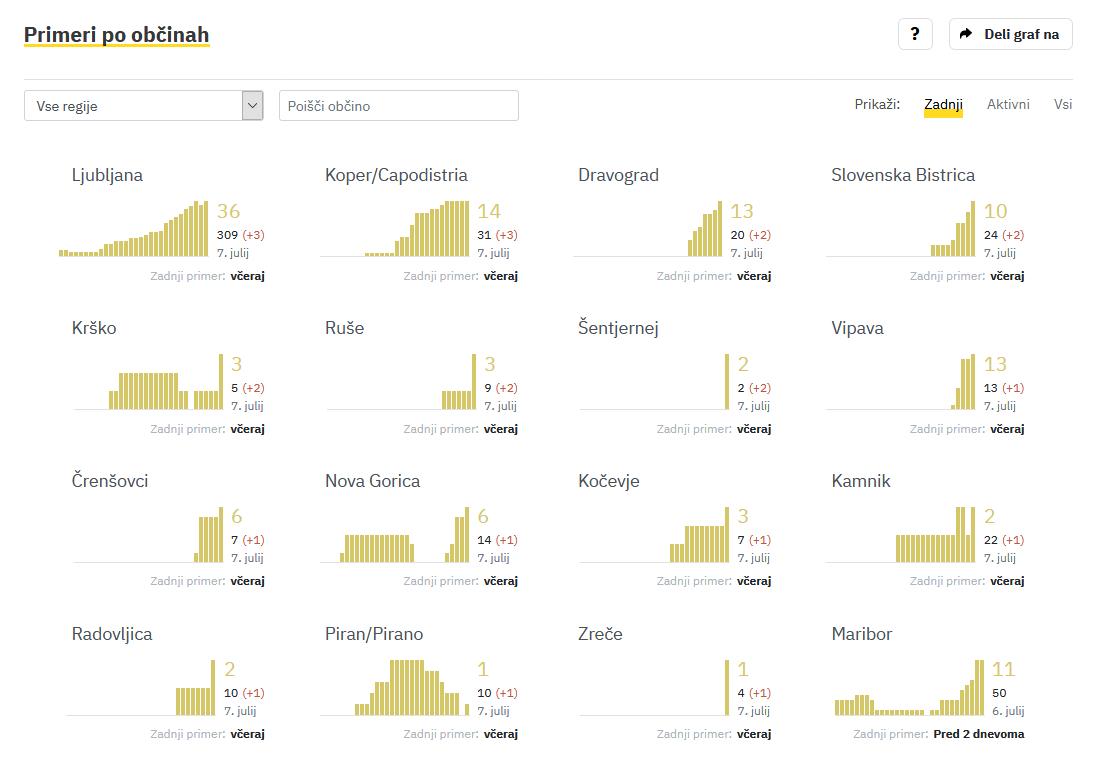 Tri okužbe z novim koronavirusom so v torek potrdili v Ljubljani in Kopru. Dve okužbi so poleg v Dravogradu odkrili še v Slovenski Bistrici, Rušah, Krškem in Šentjerneju, po eno pa v Kamniku, Novi Gorici, Vipavi, Piranu, Radovljici, Črenšovcih, Kočevju in v Zrečah, kažejo podatki sledilnika za covid-19.