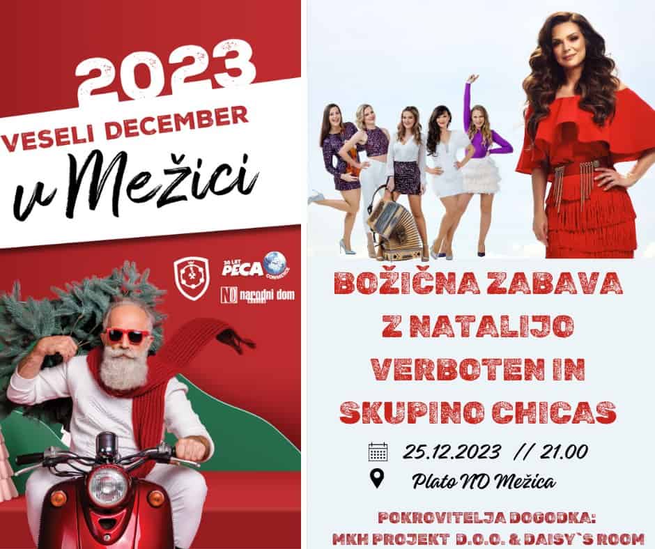 V ponedeljek, 25. decembra 2023, od 21. ure dalje, prihaja na plato pred Narodni dom Mežica ena in edina Natalija Verboten, ki bo s svojim čarobnim nastopom napolnila ozračje s prazničnim vzdušjem. Velja pa tudi za eno najbolj priljubljenih slovenskih pevk. Zagotovo poznate njene številne hite, ki še danes grejejo srce: Rdeč Ferari, Bodi ti moj Božiček, Dva policaja, Zate na triglav, Lizika, Pozabi me in mnoge druge.