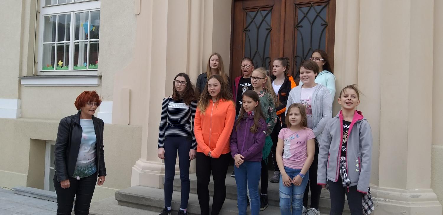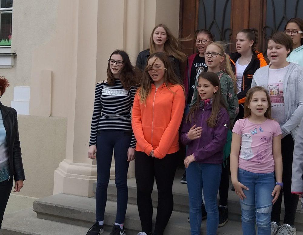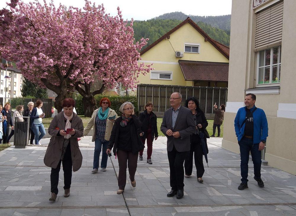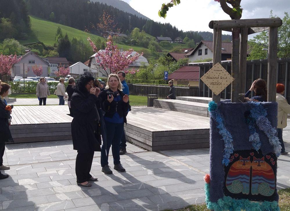Pred Osnovno šolo Mežica smo si ogledali tri barvita drevesa, ki v teh dneh poleg cvetočih Japonskih češenj krasijo tamkajšnje dvorišče. Učenke pa so nam zapele tudi šolsko himno.