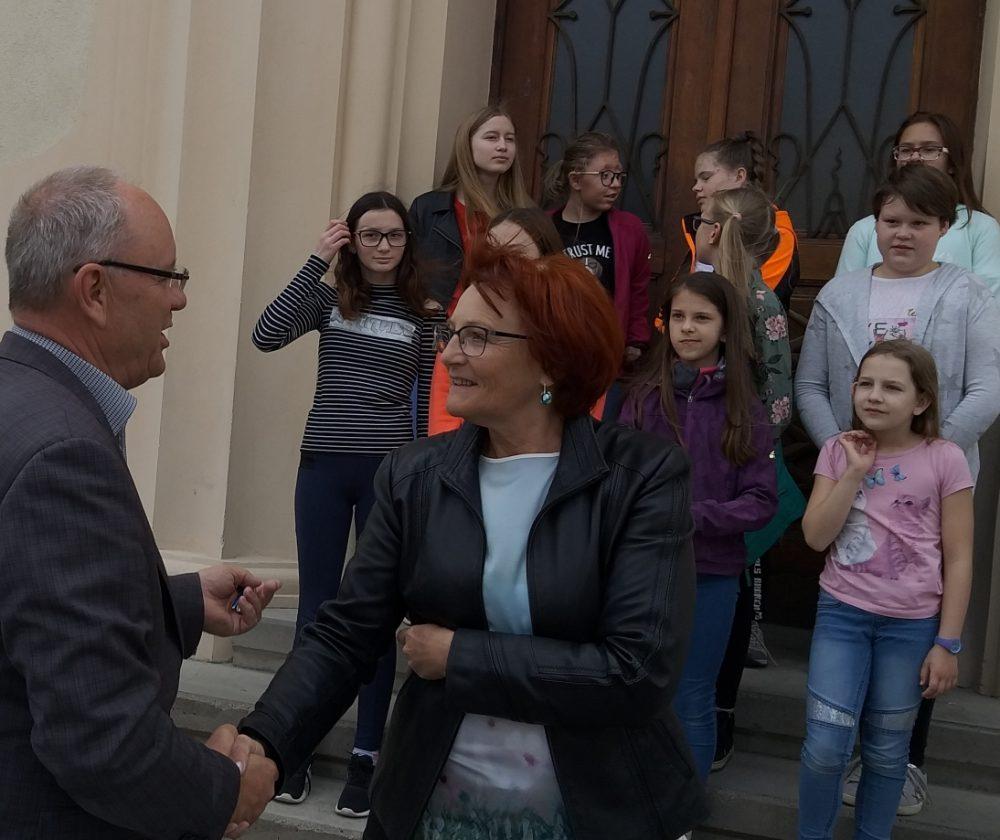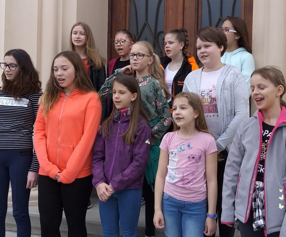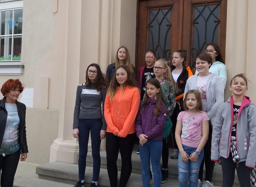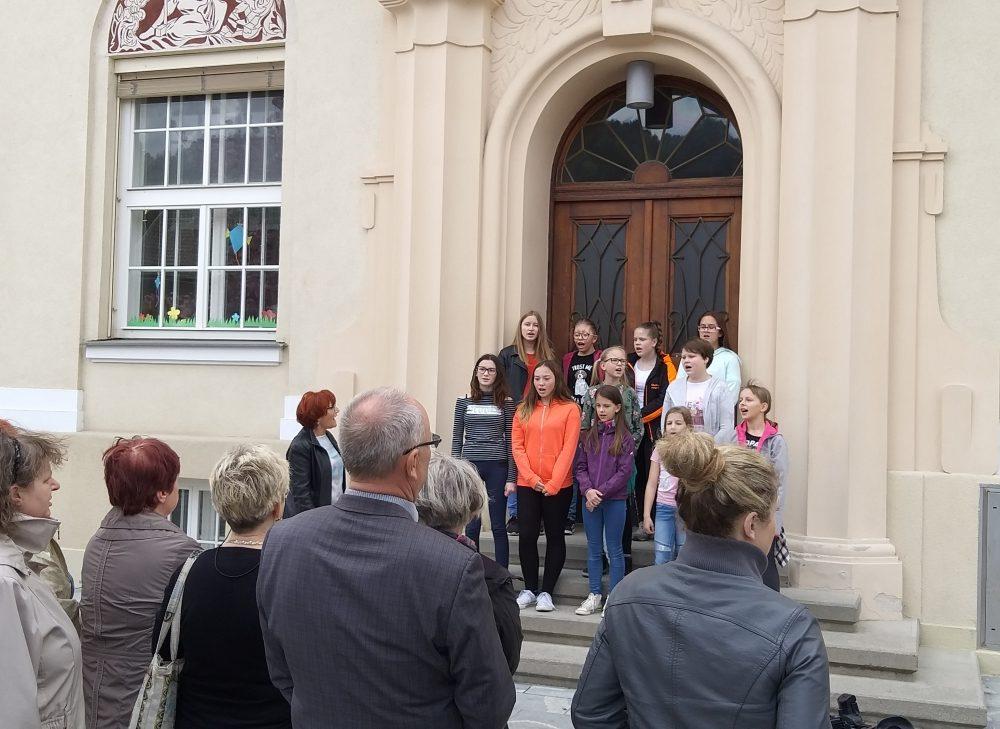 Pred Osnovno šolo Mežica smo si ogledali tri barvita drevesa, ki v teh dneh poleg cvetočih Japonskih češenj krasijo tamkajšnje dvorišče. Učenke pa so nam zapele tudi šolsko himno.