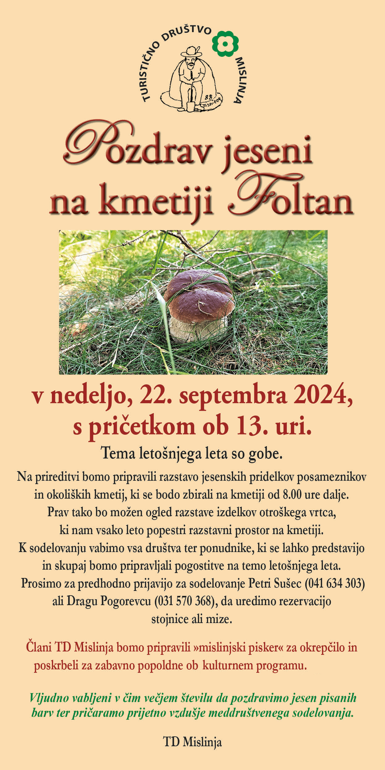 Vroče poletje se je poslovilo in se prevesilo v prijetno, s soncem obsijano jesen, ki s seboj prinaša kopico prireditev in opravil. V nedeljo, 22. septembra 2024, vas Turistično društvo Mislinja vabi na prireditev ''Pozdrav jeseni'', na kmetijo Foltan v Mislinji, s pričetkom ob 13. uri.