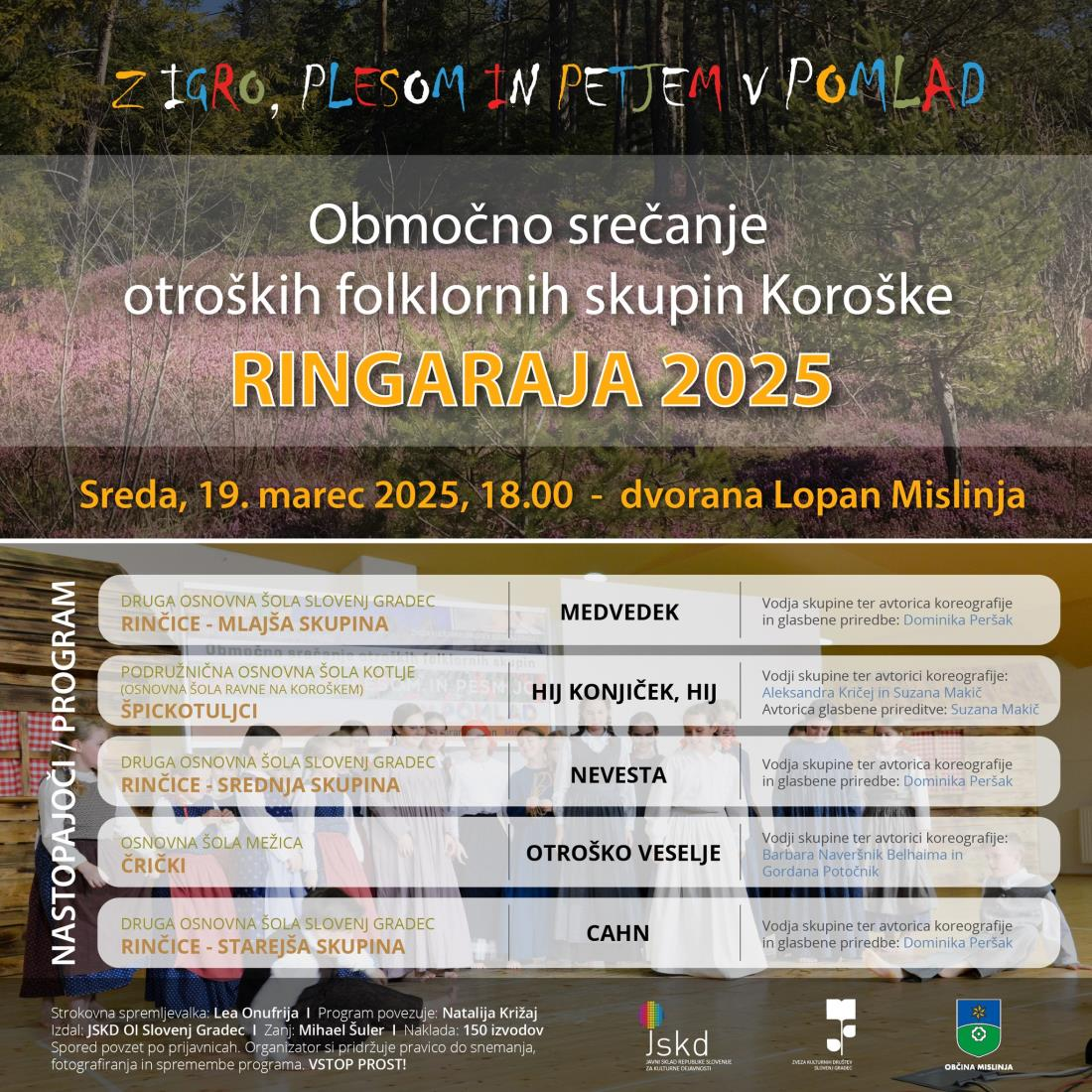 Javni sklad RS za kulturne dejavnosti v sodelovanju z Občino Mislinja organizira Območno srečanje otroških folklornih skupin Koroške – Ringaraja 2025, ki bo potekalo v sredo, 19. marca 2025, ob 18. uri v dvorani Lopan Mislinja.