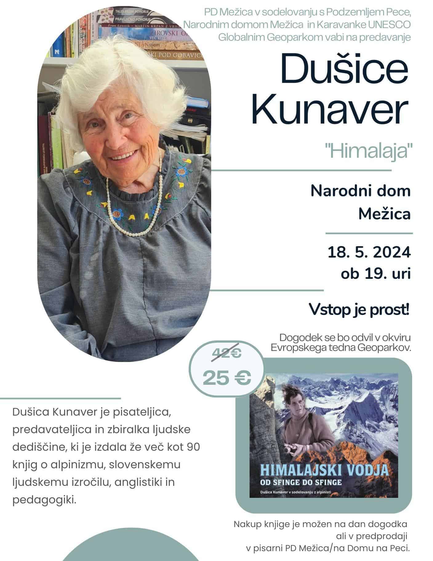 V soboto, 18. maja 2024, ob 19. uri, bo v Narodnem domu Mežica potekalo zanimivo predavanje Dušice Kunaver. Predstavila bo najnovejšo knjigo - Himalajski vodja: od Sfinge do Sfinge.