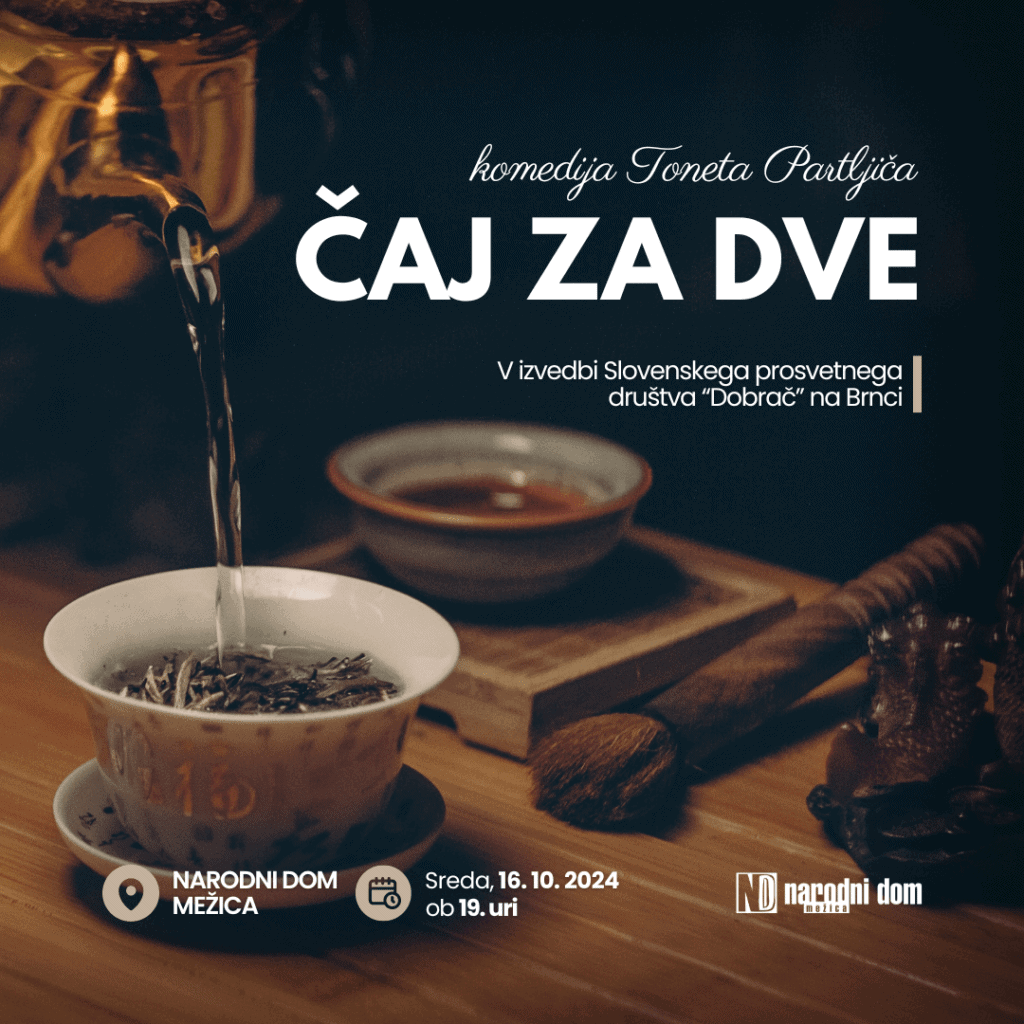 V izvedbi Slovenskega prosvetnega društva »Dobrač« na Brnici si boste lahko jutri, v sredo, 16. oktobra 2024, ob 19. uri, ogledali v Narodnem domu Mežica komedijo "Čaj za dve". Avtor le-te je Tone Partljič.