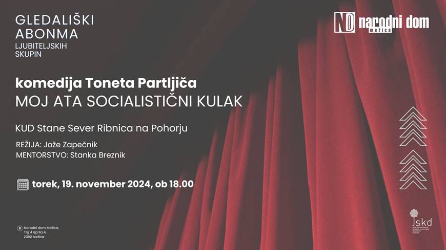 V torek, 19. novembra 2024, ob 18. uri, vljudno vabljeni v Narodni dom Mežica na ogled komedije Toneta Partljiča Moj ata socialistični kulak, ki jo bodo izvedli KUD Stane Sever Ribnica na Pohorju.