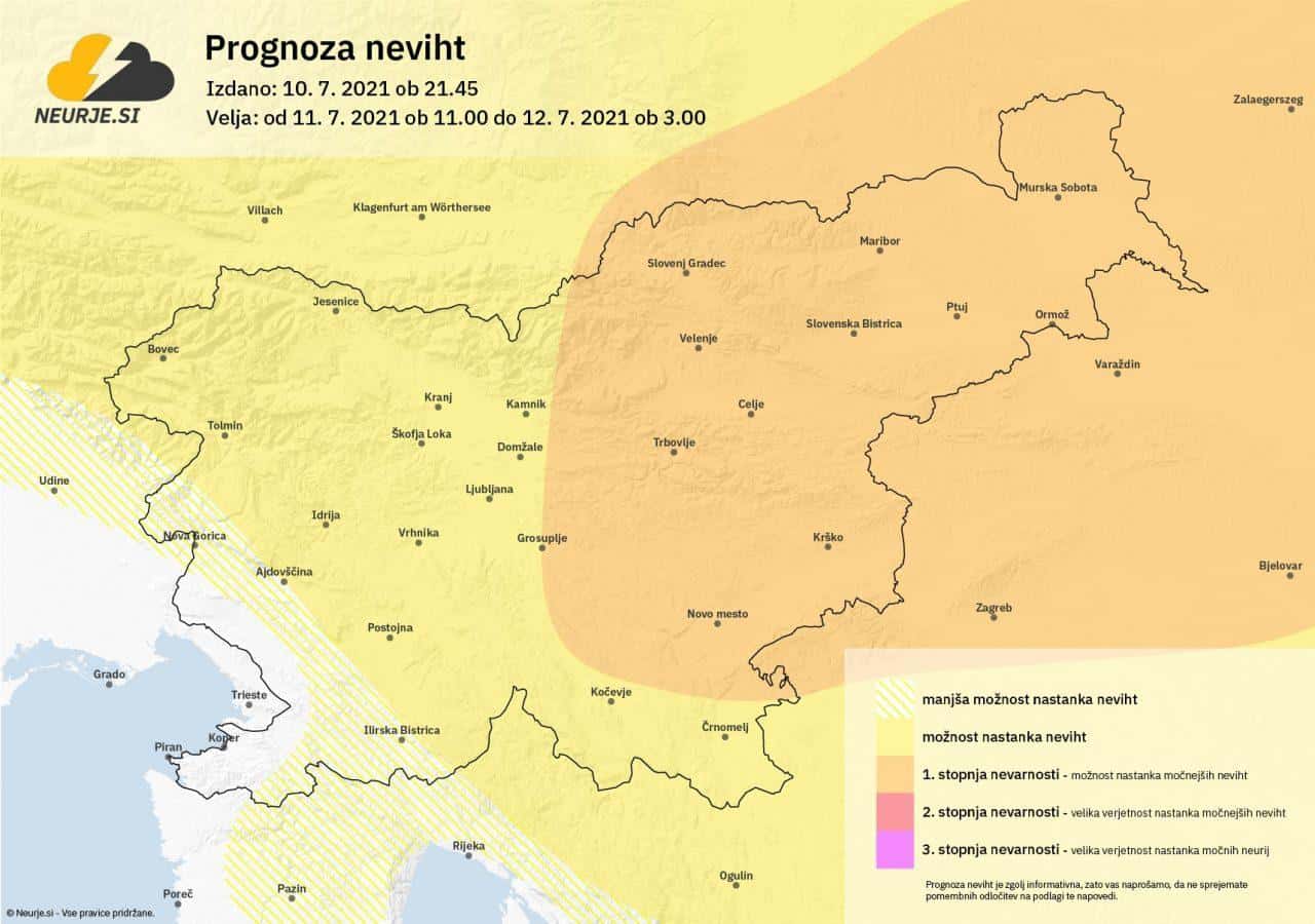 Krajevno bodo popoldan in zvečer predvsem v severovzhodni in deloma vzhodni Sloveniji možne močnejše stacionarne nevihte z dolgotrajnejšimi močnejšimi nalivi, točo in lokalnim močnejšim nevihtnim pišem (downburst). Ob nastanku močnejših neviht lahko lokalno pade večja količina toče.