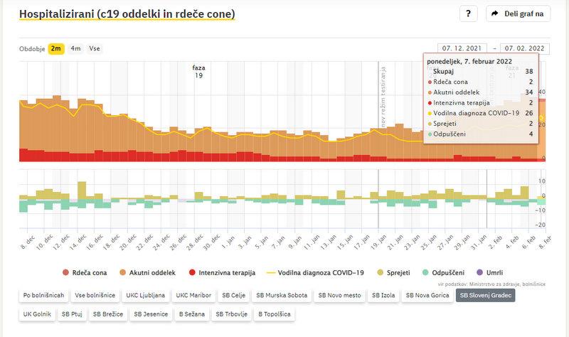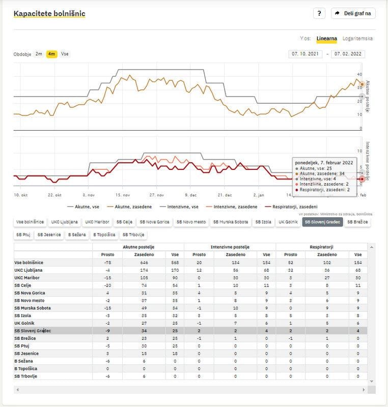 Na navadnih oddelkih je zaradi covida-19 hospitaliziranih 441 bolnikov, na intenzivnih 116. Skupno število hospitaliziranih s potrjeno okužbo je 974, pri čemer je 417 bolnikov hospitaliziranih s covidom-19. Od teh jih na navadnih oddelkih 399, na intenzivnih pa 18.