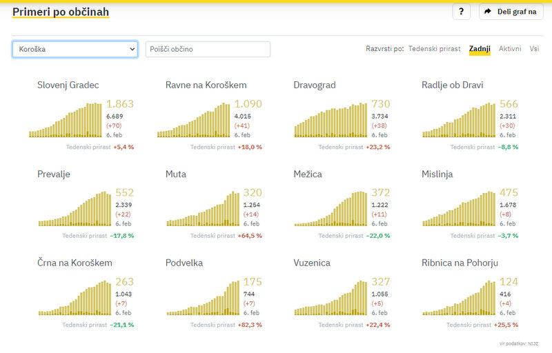 Na Koroškem so včeraj potrdili 257 novih okužb, dan pred tem 304. V Slovenj Gradcu so jih zabeležili 70, na Ravnah na Koroškem 41, v Dravogradu 38, v Radljah ob Dravi 30, na Prevaljah 22, na Muti 14, v Mežici 11, v Mislinji 8, v Črni na Koroškem in Podvelki po 7, v Vuzenici 5, v Ribnici na Pohorju pa 4.
