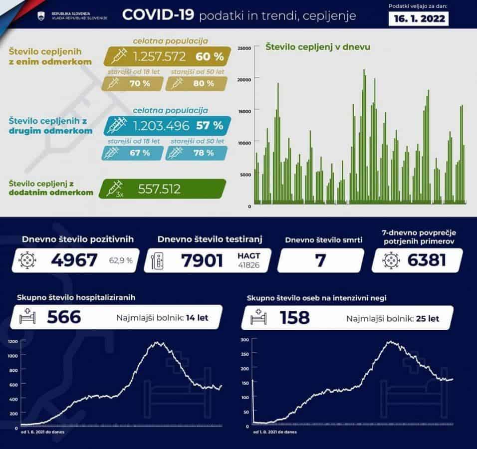 V nedeljo so v Sloveniji ob opravljenih 7901 PCR-testih potrdili 4967 okužb z novim koronavirusom, dan pred tem so ob opravljenih 10.299 PCR-testih potrdili 6012 okužb. Delež pozitivnih PCR-testov je znašal 62,8 odstotka, dan pred tem je bil 58,4–odstoten. Opravili so tudi 41.826 hitrih testov, katerih pozitivne rezultate preverjajo še s PCR-testi, dan pred tem 75.727.