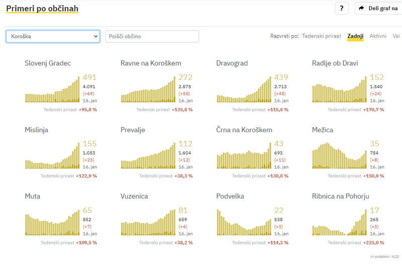 Na Koroškem so včeraj potrdili 267 novih okužb. V Slovenj Gradcu so jih zabeležili 69, na Ravnah na Koroškem 55, v Dravogradu 45, v Radljah ob Dravi 24, v Mislinji 23, na Prevaljah 12, v Črni na Koroškem 11, v Mežici 8, na Muti 7, v Vuzenici 4, v Podvelki 3 in Ribnici na Pohorju pa po 3.