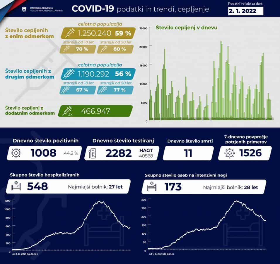 V nedeljo so v Sloveniji ob 2282 PCR-testih potrdili 1008 okužb z novim koronavirusom, dan pred tem so ob 1981 PCR-testih potrdili 829 okužb. Delež pozitivnih PCR-testov znaša 44,2 odstotka, dan pred tem 41,8 odstotka. Opravili so tudi 40.568 hitrih antigenskih testov, katerih pozitivne rezultate potrjujejo še s PCR-testiranjem, dan pred tem 11.133.