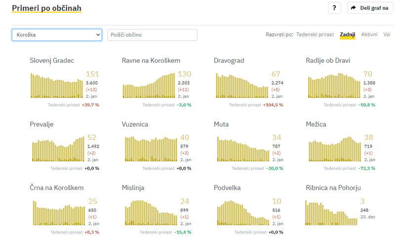 Na Koroškem so včeraj potrdili 42 novih okužb. Največ v Slovenj Gradcu, in sicer 13, na Ravnah na Koroškem 11, v Dravogradu 5, v Radljah ob Dravi 3, na Prevaljah, v Vuzenici in na Muti po 2, v Mežici, Črni na Koroškem, Mislinji in Podvelki pa po 1.