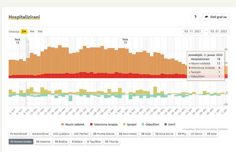 Po podatkih sledilnika v SB Slovenj Gradec zdravijo 18 covidnih bolnikov. Od teh jih 6 potrebuje intenzivno zdravljenje. V domačo oskrbo so odpustili 1 osebo, 1 pa so na novo sprejeli v bolnišnico.