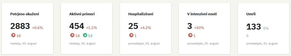 Trend obolelosti s koronavirusom v Slovenijiin podatki za dan 30. 8. 2020 (00:00–24:00):