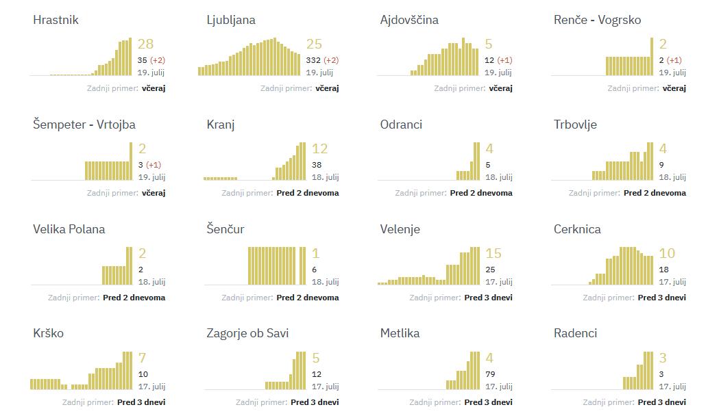 Dva nova primera okužbe so v nedeljo potrdili v Hrastniku, kjer je trenutno eno od žarišč, in dva v Ljubljani. Poleg tega so okužbo potrdili še v občinah Ajdovščina, Šempeter - Vrtojba in Renče - Vogrsko, kažejo podatki Sledilnika za covid-19. Po njihovih informacijah ni noben nov primer v domovih za starejše ali med zdravstvenimi delavci. Trenutno je v državi 237 aktivnih primerov okužbe z novim koronavirusom.