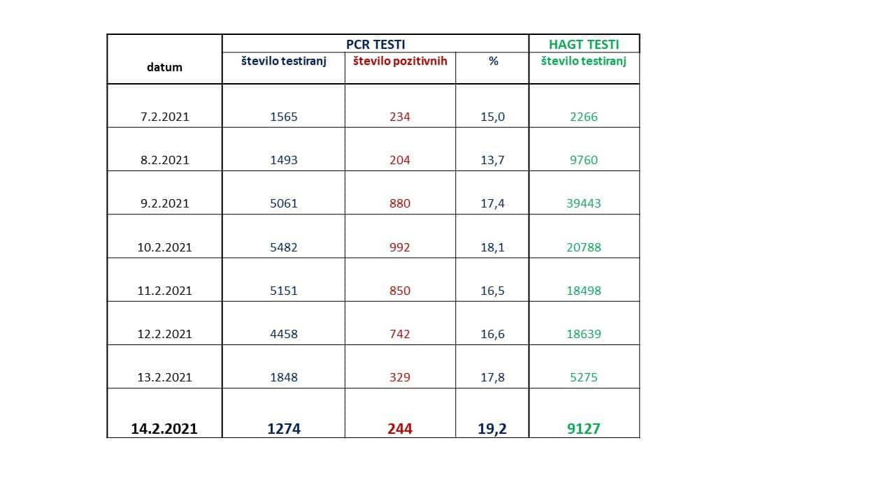 Včeraj je bilo opravljenih 1.274 PCR testov in 9,127 hitrih antigenskih testov. S PCR testi potrjenih 244 novih okužb. Od sobote se vsi pozitivni hitri testi preverjajo še s PCR testi.