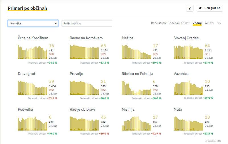 Včeraj so nove okužbe potrdili v sedmih koroških občinah, največ v Črni na Koroškem, kjer so zabeležili 3, v Mežici in na Ravnah na Koroškem so potrdili po 2, v Slovenj Gradcu, Dravogradu, na Prevaljah in v Ribnici na Pohorju pa po 1.