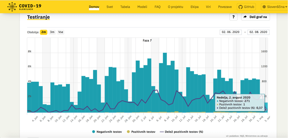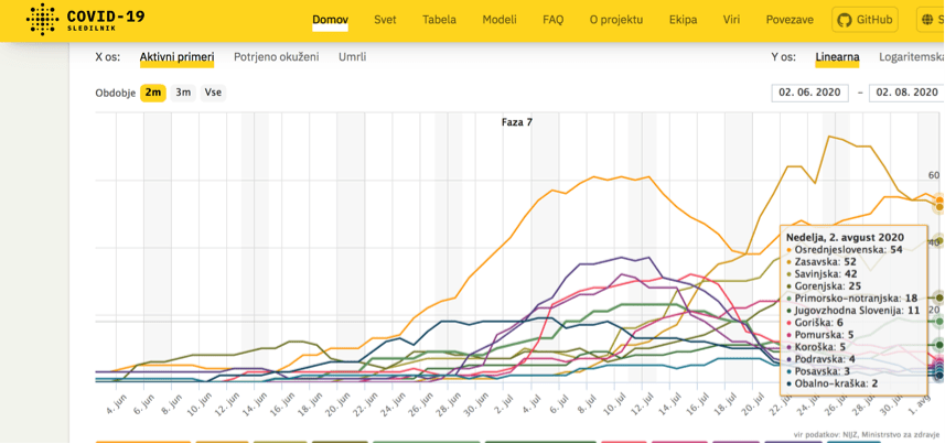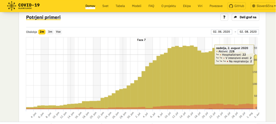 V nedeljo 2.8.2020 so opravili 272 testov, eden od teh je bil pozitiven na covid-19. Po podatkih COVID-19 sledilnika smo imeli včeraj 228 aktivnih primerov okužb, 22 hospitaliziranih, 2 osebi na intenzivni negi, 2 osebi pa sta potrebovali respiratorje.