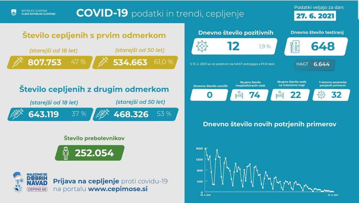 Trend obolelosti s koronavirusom ter število cepljenih in prebolevnikov v Sloveniji na dan 27. 6. 2021 (00:00-24:00)