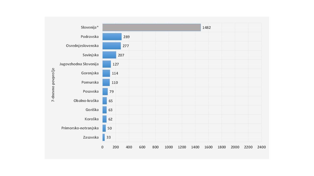 Kacin je predstavil tudi 7-dnevno povprečje v regijah, glede na število prebivalcev. Na prvem mestu je Podravska regija z 289 okuženimi, najmanj pa jih ima Zasavska regija s 33 okuženimi.